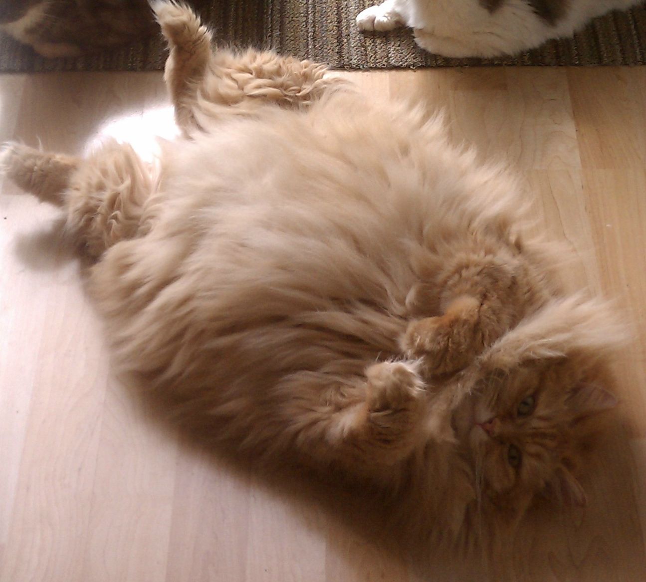 The most common and instinctual reason for belly exposure is when two cats are engaging in play or about to have an altercation. The cat that flops onto its side exposing its belly is NOT being submissive; it is exposing all of its weapons. The cat that is in standing position best watch out because it is about to get greeted with teeth and four paws full of claws! If the ears are flat back against the head, the tail is flicking from side to side and your cat seems wound up and agitated, it probably is, and sticking your hand in the mix is not recommended. Respect this; this is not a funny way to play with your cat. Instead, stuff a kick pillow or other large toy in their belly and let them attack that!