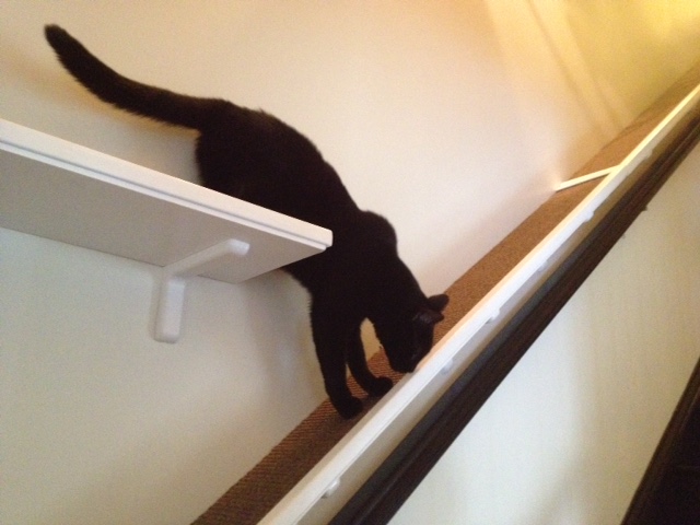 Corner area with sisal tread shelves leading to a wall of windows and a long sisaled run across those windows. This allowed the cats easy access to an already in place wide windowsill for maximized bird and squirrel viewing!