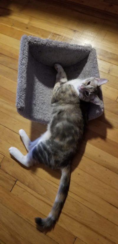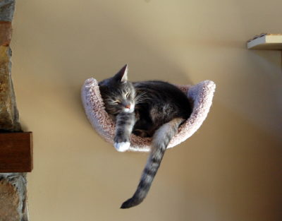 These beds are versatile and can be offered as a single resting place, window perch or used as a destination spot for an entire vertical space system. Plaster walls, not handy? No problem! It can also be placed on the floor as a cat rocking chair. It is a well loved piece of feline furniture even if not mounted to the wall. Cats love to nap in it, play in it and literally rock in it.